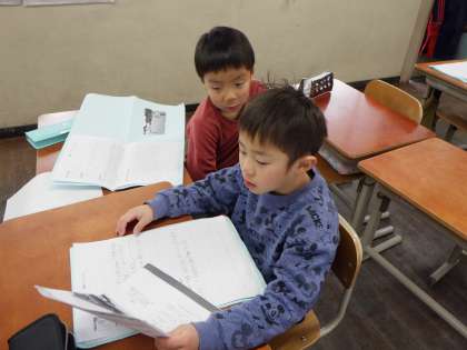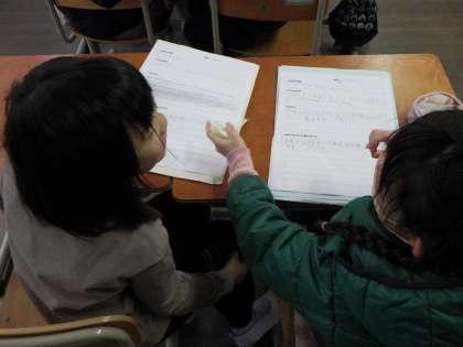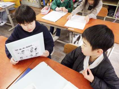 国語の学習では、自分の紹介したい遊びをカードに書き交流しました。交流を通して知らなかった遊びが知れたり、選んだ遊びが同じでも書いている内容が違っていて新たな発見があったり、充実した時間になりました。