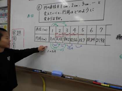 算数の学習で、円周と直径の変わり方を表に表して見つける学習を行いました。