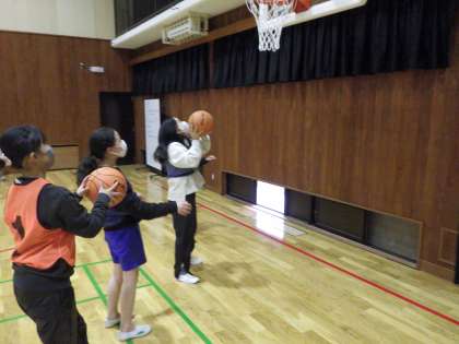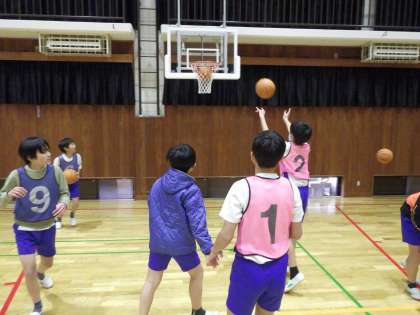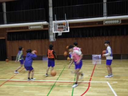バスケットボールの体慣らしです。1人1つボールを持ってドリブルやシュートの練習をしたり、同じチームの友達とパスをし合ったりしています。どんどんボールにふれましょう。