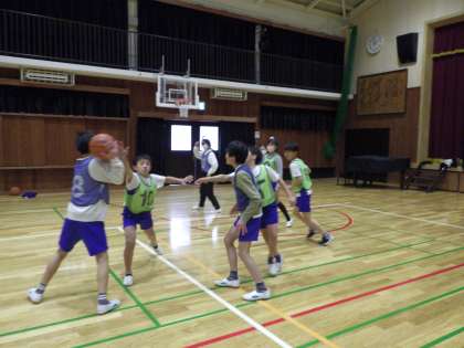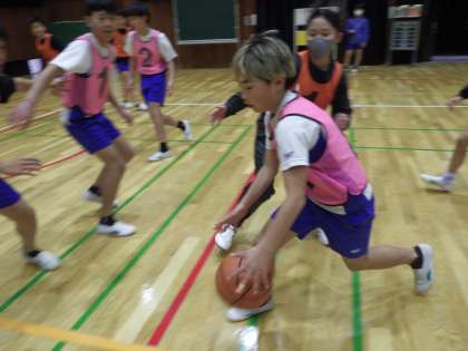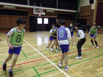 試合が始まりました。白熱しています。まずは単元の前半のねらい1です。ルールに慣れて、チームの特徴を知りましょう。