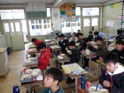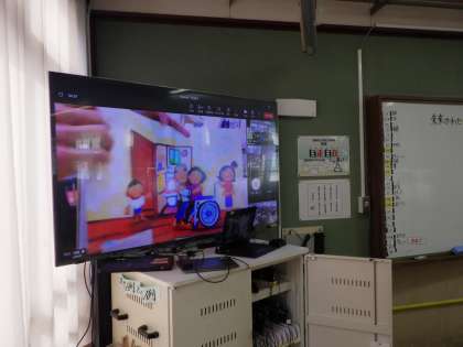 給食時間に図書委員会が読み聞かせをしてくれています。今日はオンラインで本を見ながら6年生が読みました。とても上手でしたよ。みんなよく見て、聞いていました。