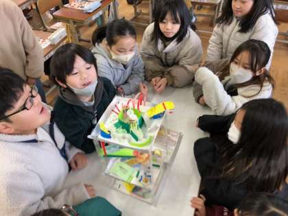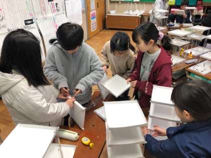 仕組み作りの最後が難しく、班の友達を協力して作っていました。
