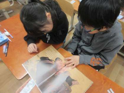 友達に紹介する「どうぶつの赤ちゃん」を図鑑を見ながら選んでいます。かわいい動物に子ども達は夢中です。