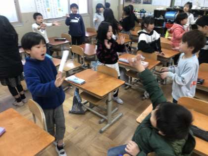 「英語活動」2回目の学習です。前の時間に歌ったHello songに慣れてきた様子で、子ども達はみんなノリノリで歌っていました。