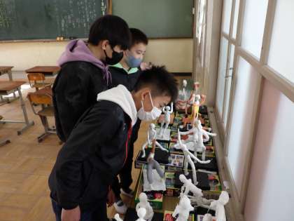 図工の作品を休み時間に見ている人がいます。誰の夢かな?と話しながら見てるのかな。