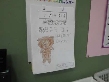 3学期からスタートしたカウントダウンカレンダー。卒業式まで残り50日から始めましたが、明日で残り25日です。半分が過ぎました。十の位ももうすぐ「1」になります。