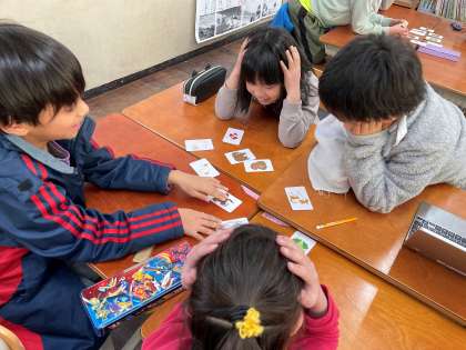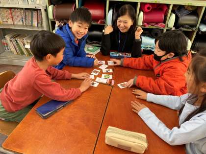 外国語活動の時間は、オリジナルの絵本を紹介するためにポインティングゲームを通して動物の名前を学習しました。どのグループも白熱した戦いになっていました。