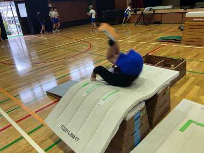 こちらも台上前転の練習をしています。とび箱を2台並べてマットを乗せています。首を返して回る姿勢が作れるようにしているようです。NICE工夫!
