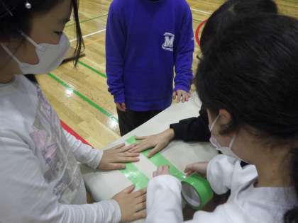 たての開脚跳びを練習しています。が、なかなか難しいらしいです。そこで跳べる人の試技を見てみると、どうも手を置く位置が大切なようです。テープを貼って、意識してみると…。おっ!跳べた!