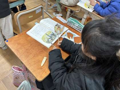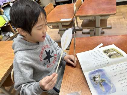 国語科「たぬきの糸車」で,登場人物のセリフや気持ちを想像して,ペープサートを使ってやり取りをしました。初めて使うペープサートに,うきうきした表情で,上手にお話をしていました。