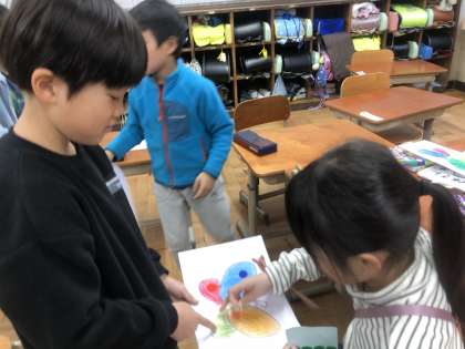英語活動「ちょうちょをつくろう」の学習で,自分のオリジナルのちょうちょを作りました。学習した色のシールをもらうために,「○○ please.」「Here you are.」「Thank you.」を使ってやり取りをしました。英語を使って,もらったシールで作ったちょうちょは,個性豊かで素敵なちょうちょになりました。このちょうちょは,生活科で考えている新1年生のための飾りにも活躍する予定です。1年生最後の英語活動,みんなで楽しく学習することができました。