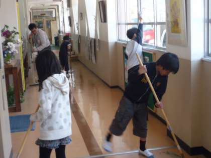 新学年になり,そうじ場所もすっかり替わり,新しい場所のそうじとなりました。4年生は,職員室前の廊下を担当します。この場所は,廊下の掃きそうじだけでなく,窓の拭きそうじも重要です。今日は,ぬれ雑巾でせっせと頑張っていました。ぬれ雑巾の後,空拭きすると,とてもきれいになります。また,北校舎北側の体育館へ向かうオレンジロードは5年生が担います。今日は,春休みの間に溜まったオレンジマットの下の砂を丁寧に掃き出してくれました。そして,1階の洗面所は3年生。何回もたわしでこすってきれいにしました。