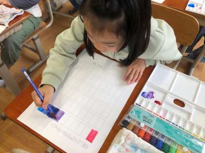 絵の具を混ぜたり、水の量を調節したりして美しいグラデーションを表しました。これからの学習に生かしてほしいです。