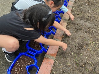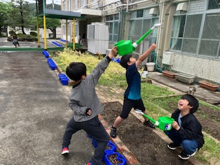ホウセンカとヒマワリの種を学校園にまきました。