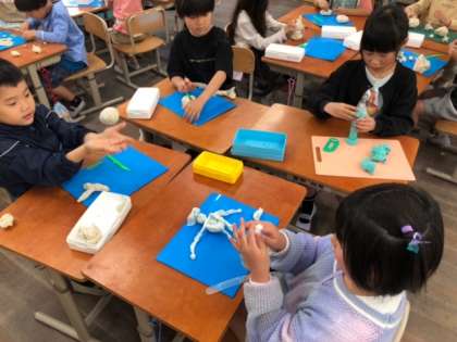 図画工作科の時間には、にぎったねん土の形から思いついた物を作りました。