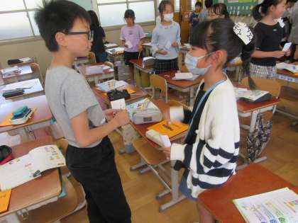 外国語活動では好きなもの嫌いなものを使って自己紹介を行いました。友達から聞いた好きなもの,嫌いなものでビンゴゲームをすると,とても盛り上がりました。