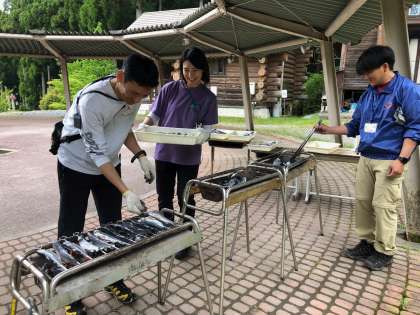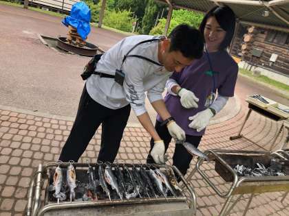 こちらでは、校長先生たちが子どもたちがとったイワナを焼き始めました。
