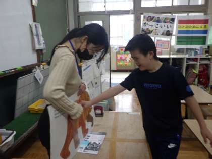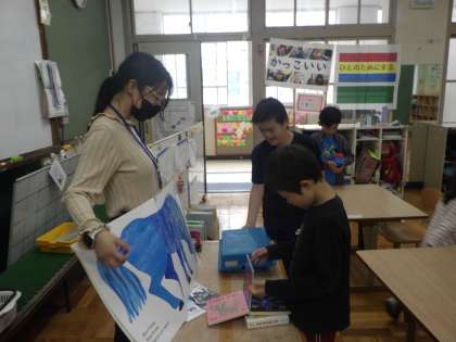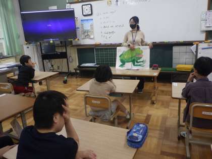 ALTの先生に大型絵本を読んでもらったり、体を動かしたりしながら楽しく英語に親しんでいます。