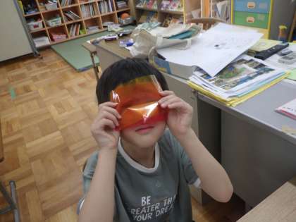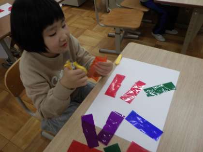 セロファンを使って、色の重なりを楽しんだり、重なった部分で形を見つけたりしました。色が重なると暗い色ができたり明るい色ができたりいろいろな色ができるのことをとっても楽しんでいました。「海の夕焼け」や「花火」など子どもたちは想像力豊かに作品を作っていました!
