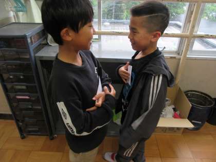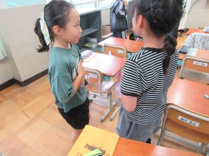 今日は,「Let's play cards!」の最後の時間だったので,学習した遊びに誘う表現を使って,友達を遊びに誘うやり取りをしました。授業が終わって,中間休みに学習したことを活かして英語で遊びに誘うこの姿も見られました。
