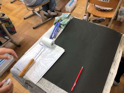 2時間目からはいよいよ画用紙に描いていきます。色画用紙を使う人、ローラーを使う人などどんな工夫をすれば自分の描きたい花が描けるか色々試しています。