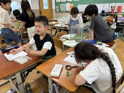 子どもたちの取ってきたモンシロチョウのたまごが孵化し、幼虫が育っています。毎日たくさんたまごを取ってくるので、生まれたてや、もっと時間がたっている幼虫などさまざまいて、その違いを比べながら観察しています。