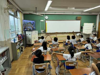 先週にたてわりで作った招待状を6年生が代表して1年生に渡しました。3年生はその様子を教室で見ています。最後は1年生に手を振りました。1年生これからもよろしくね。