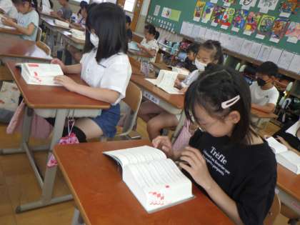 図書館司書の先生から,漢字辞典の使い方を学んでいます。国語辞典とは違い,引き方が難しいようです。