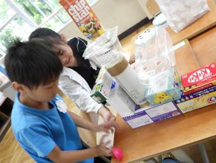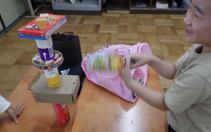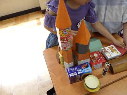 たくさんの箱つかって、自由に積み上げたり組み立てたりして、いろいろな形があることを知りました。次は特徴を見つけて、仲間分けをしていきます。
