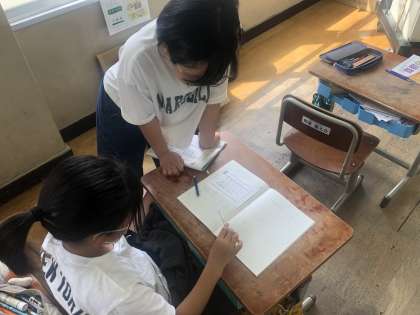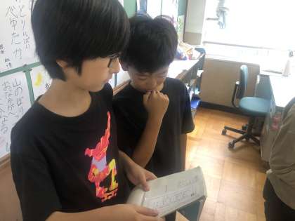 小数のかけ算の練習を繰り返し行っています。友達と回答を比べ合うことで正確に計算ができているかを確かめています。時に教え合う場面も見られるなど互いに高めあっている様子も伺えます。