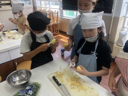5年生になってずっと楽しみにしていた調理実習の時間です。山の家の野外炊事での経験を生かした協力しながら作業を進めています。