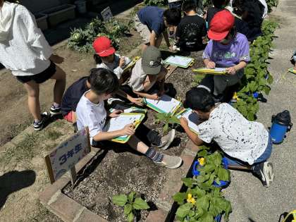 「ヒマワリと比べると小さいね。」「前は葉が2枚だったけど、11枚に増えてた!」など成長の様子を詳しくみていました。