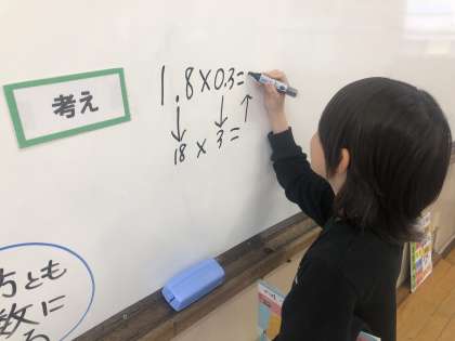 整数×小数の計算に続いて、今日からは小数×小数の計算にチャレンジしました。子ども達は、前回までの学びを生かしながら学習を進めて解決に向かいました。学習中には、子ども達がホワイトボードに自分の考えを書いて学習を進めていく場面もあります。どんどんみんなで学習を進めていく楽しさを味わってほしいです。