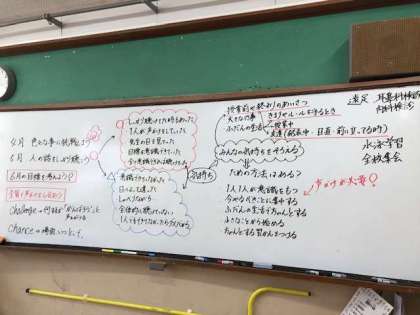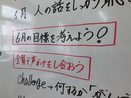 1組と2組で授業をしました。どちらのクラスも同じ成果と課題を出していました。最終的に同じ目標を立てていました。という事で、6月は「全員で声かけをし合おう」に決まりました。