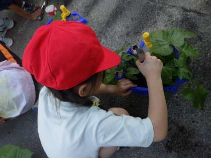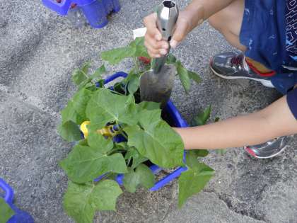 毎日、水やりをして育てているあさがおがぐんぐんのびています。より大きく成長できるように間引きを行いました。「家でも育てるぞ!」と嬉しそうにしている姿が見られました。