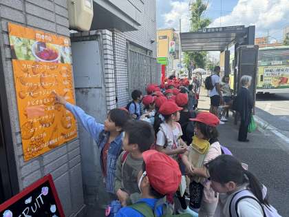 銀閣寺道駅でバスが来るのを待ちます。近くのスムージー屋を見つけて「飲みたい〜」と子どもたち。お家に帰ってから飲んでね。