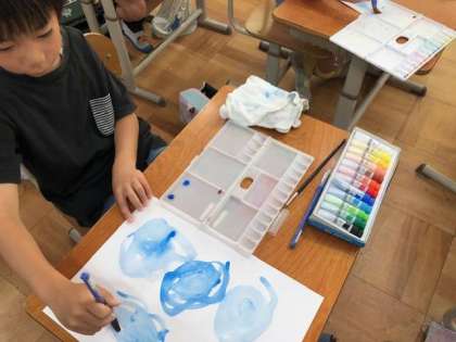 今日からの図画工作科は「6月の絵」の学習に入りました。梅雨の時期と言えば…というテーマで色々想像を膨らませました。みんなでアジサイを描くことにしました。