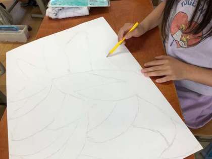 葉の輪郭をえんぴつでうすく描いていきます。ギザギザ部分はこの後絵の具でぬるので、そのことも考えて大きく描いています。