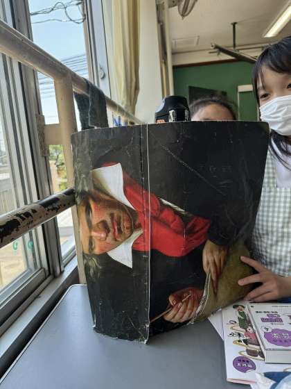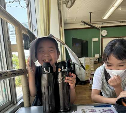 子どもたちが同じ水筒を並べてどっちでしょうクイズをしていました。とても難しかったです!