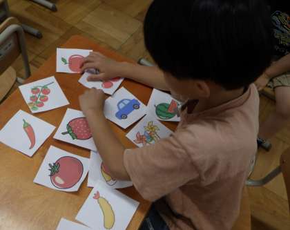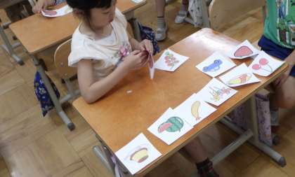 絵カードを使いながら、リズムをつなげて自分たちのオリジナル音楽をつくっています。リズムに合わせて披露してもらう日が楽しみです。