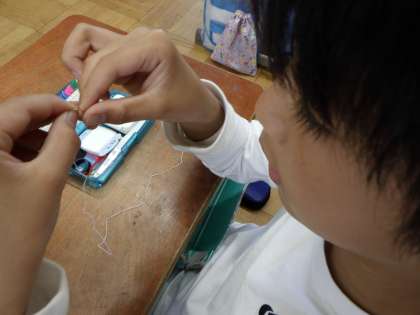家庭科では裁縫の学習が始まりました。今日は針穴に糸を通すことを頑張りました。次は、玉結びと玉止めに挑戦です!!