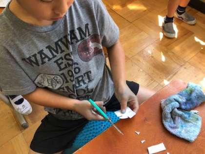 後半の時間は単元の1時間目に赤や青でぬった画用紙をアジサイの花びらの形に切っていきます。