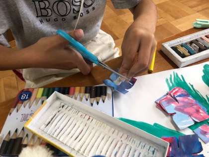 今日はアジサイの花びらを貼り付けました。みんなどこに貼るかまず置いてみて、よし!と決まったらのりで貼りました。