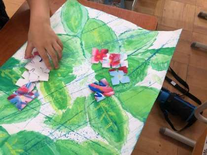 今日は2組で授業でした。アジサイの花びらを置く位置を考えています。みんなどこに置いたらバランスがよくなるか、きれいになるかを考えています。