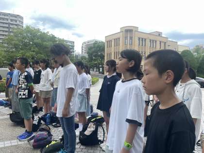 誓いの言葉を述べ、黙とうをしました。みんなで平和を願って折った千羽鶴をささげました。