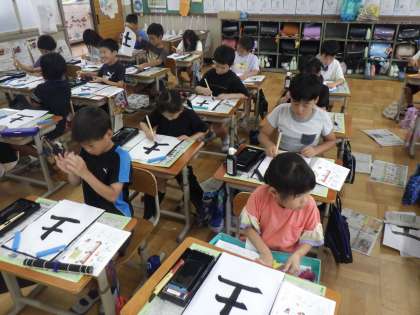 第三回目の毛筆の学習は、たて画の書き方に気を付けて「土」を書きました。