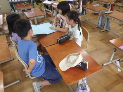係活動では、まず係ごとに1学期の仕事を振り返って、うまくいったことやそうでないことを考えました。