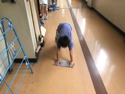廊下のぞうきんがけです。拭けば取れる汚れかどうかを見極めるのが大切です。頑張っています!