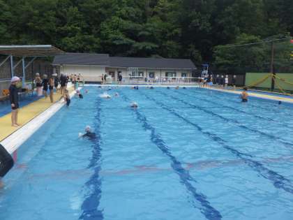 最後まであきらめずに泳ぎます。タイムを計って、速く泳げるようにペアでアドバイスし合っている子もいました。