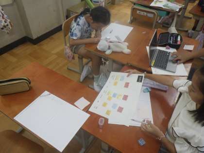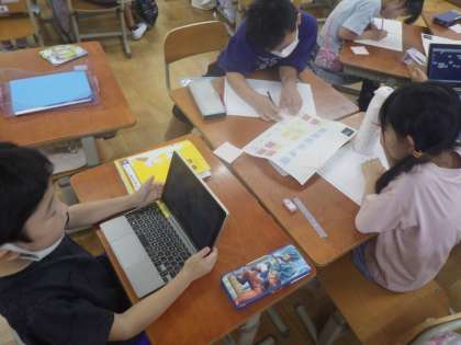 しばづけ工場で調べたことをふせんにまとめました。前回の授業で作った共有ノートをもとに、班で話し合って活動しました。